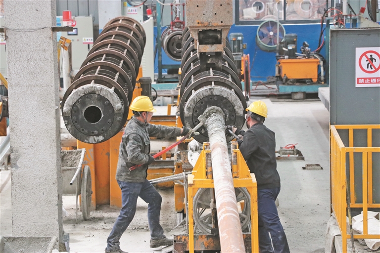 走进建华建材(宁德)有限公司高端混凝土制品智能制造项目车间,只见钢棒在自动滚焊机的电光石火下焊接成桩体骨架,吊式起重机来回转运,工人们在各自岗位上熟练操作。