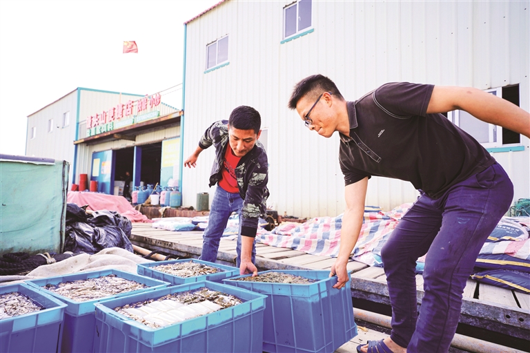 眼下,正是海参收获的季节,霞浦县沙江镇“海上田园”一派繁忙的丰收景象,当地养殖户忙着捕捞、销售海参。据悉,沙江海域共养殖海参约30000框,2023年全镇养殖产量4700吨,产值10亿元以上。图为海参收购场景。(闽东日报记者 陈容 摄)