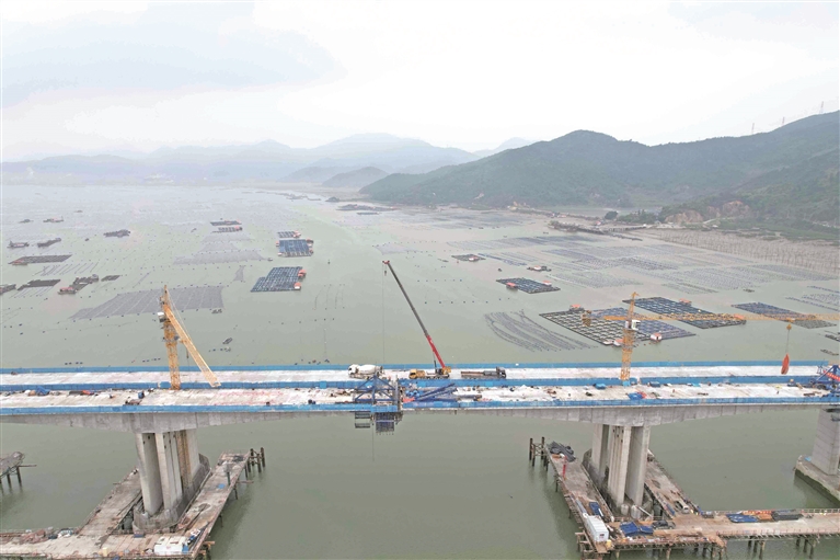 5月4日,宁上高速A6合同段跨海大桥盐田港特大桥右幅中跨顺利合龙