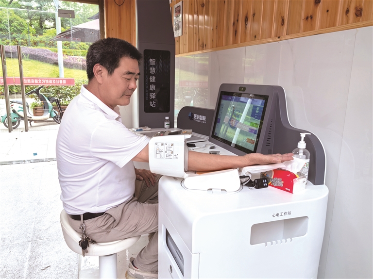 “您的血压偏高,请及时前往医院。”4月30日,在阳春社区的智慧健康驿站中,60多岁的黄子山通过自助健康检测机读取自己的血压、心率等基本健康数据。