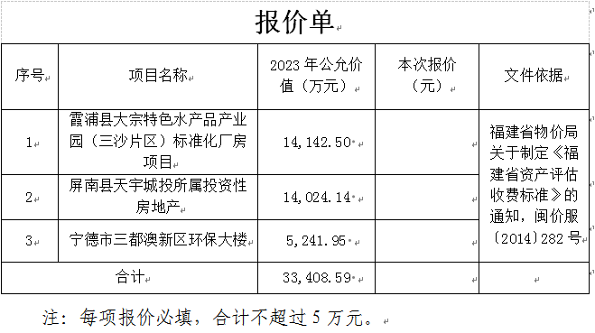 本次采购的报价标准依据福建省物价局关于制定《福建省资产评估收费标准》的通知,闽价服〔2014〕282号》中所列示收费标准,以总价不高于5万元进行报价,费用最低的中介机构作为本次中选机构(如出现报价金额相同的情况,则通过随机抽取方式确定最终中选机构)。参与报价的中介机构不足3家的,我公司有权终止本次采购。