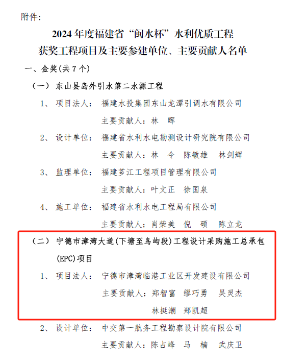 近日,福建省水利工程协会公布2024年度福建省“闽水杯”水利优质工程名单,由市临港公司负责建设的宁德市漳湾大道(下塘至鸟屿段)工程荣获2024年度福建省“闽水杯”优质工程金奖。