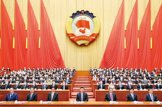 2022年3月4日,中国人民政治协商会议第十三届全国委员会第五次会议在北京人民大会堂开幕。这是习近平、李克强、栗战书、王沪宁、赵乐际、韩正、王岐山在主席台就座,汪洋代表政协第十三届全国委员会常务委员会向大会报告工作。 新华社记者 黄敬文/摄