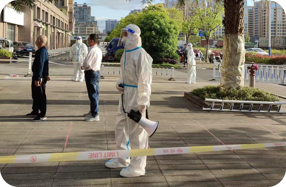 突击队员阮晓栋下沉三盛中央公园小区,身着“天使白”,顶着烈日高温,举着广播喇叭在小区内穿梭忙碌着,巡回通知小区居民到指定采集点进行核酸采集检测,协助社区开展核酸检测工作。