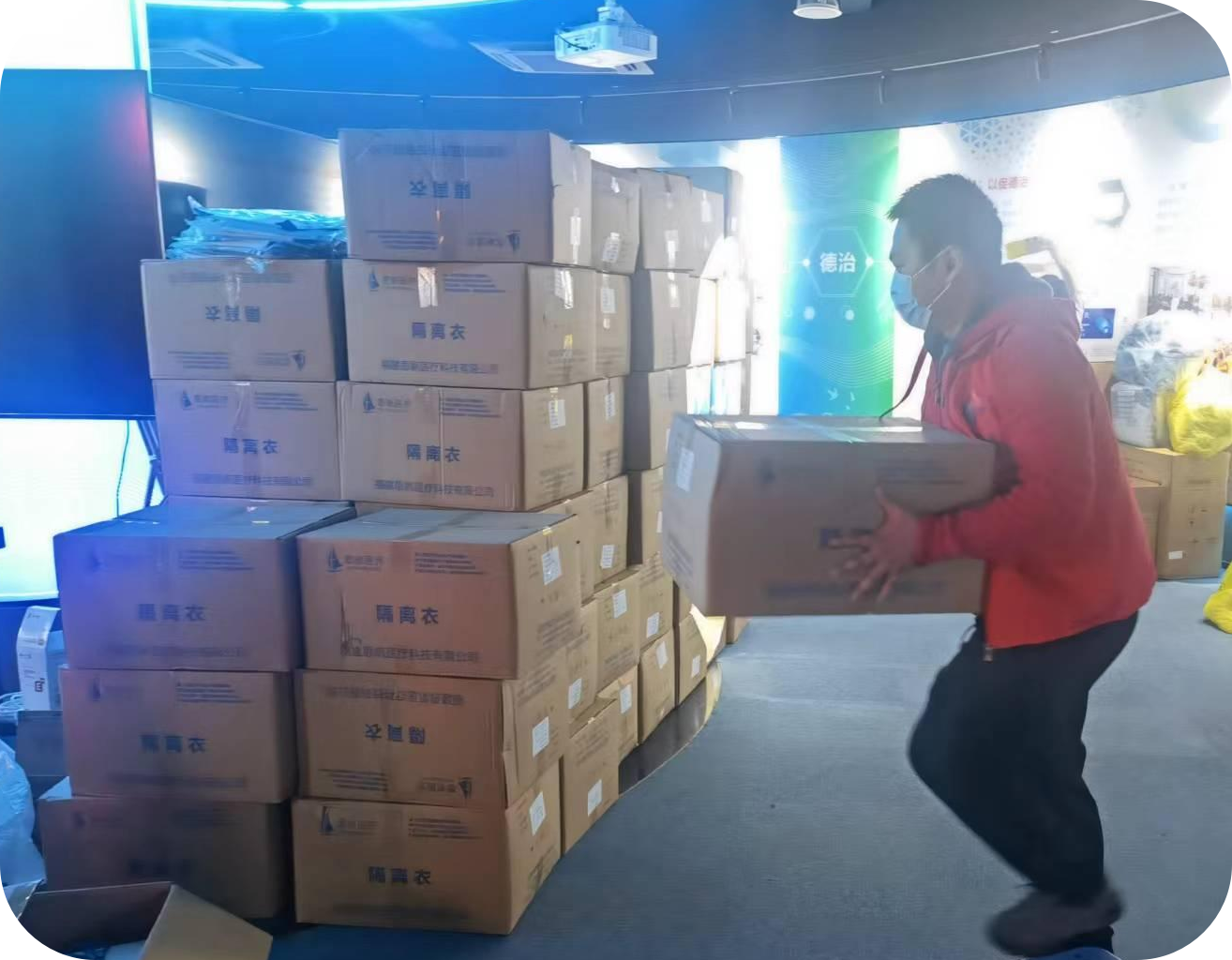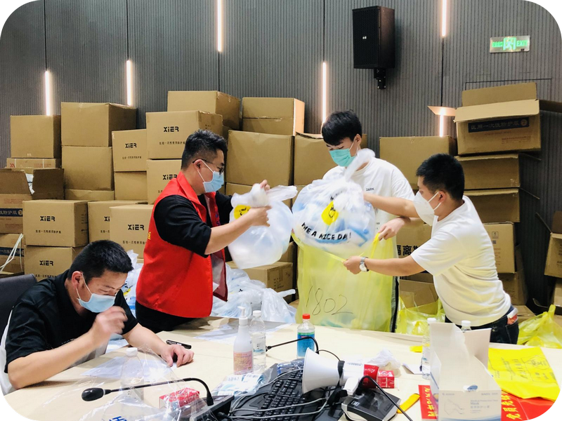 突击队员吴广辉下沉湖滨社区,协助社区工作人员将消毒液、隔离服、一次性采样瓶、镊子、84消毒液、头套、口罩、面罩、脚套、洗手液等防疫物资连夜进行分拣、分装和打包,为其他一线抗疫人员及时提供后勤保障。