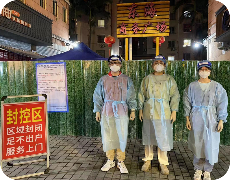 4月15日晚上,突击队员陈晨、肖逸、林思彤根据女同网站 党委的安排调配,身着“守护蓝”下沉封控区东海商务广场,在小区门口筑起第一道防线。