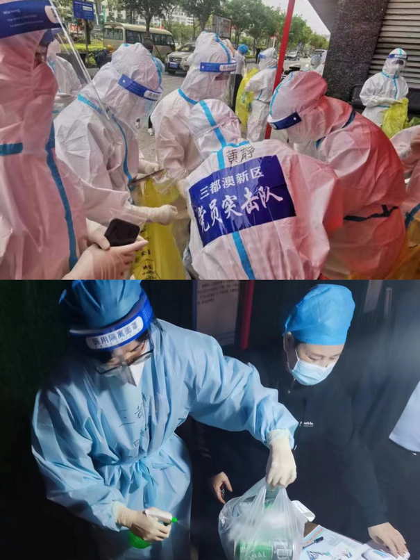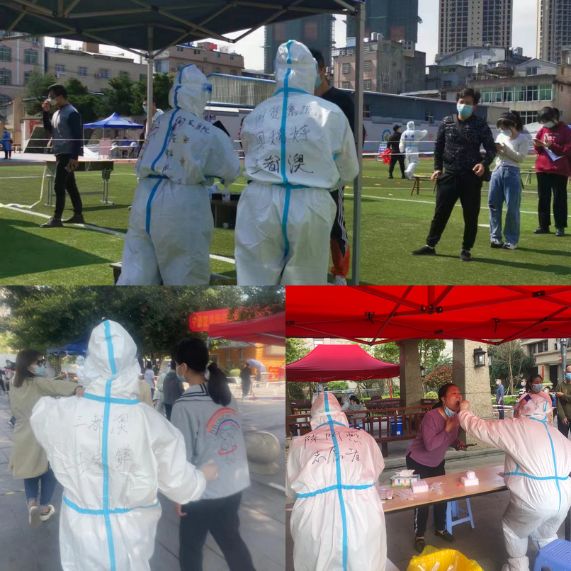 她”,主动作为,顶着烈日,身穿“大白”服,在核酸检测点进行信息录入、秩序维护、物资搬运等各项工作。