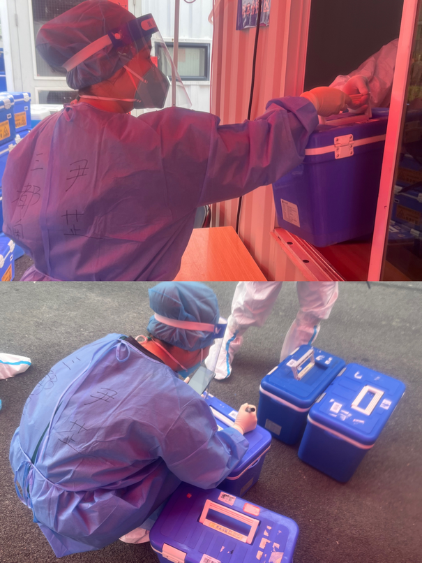 “她”,进入核酸检测中心方舱,从接收、清点核酸样本开始,填写舱号板号、按版号样本顺序扫码、撕去试管架上的标签并喷酒精消毒、试管包装后置于高压室等等,直到夜班扫码结束后,还需要将已扫样本运至医废间,同时做好数据室环境清洁并用紫外灯消毒,直至最后在规定时间内将数据上传报送,工作才算结束。
