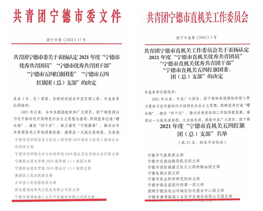 值此中国共青团成立100周年之际,市临港公司团支部荣获2021年度“宁德市五四红旗团支部”和“宁德市直机关五四红旗团支部”荣誉称号。