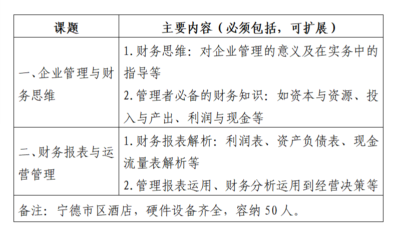 宁德市三都澳新区开发建设有限公司拟于近期举办2022年中高管、财务人员培训会,适用于企业中高管及财务人员的相关知识培训,预计50人(为期1.5天),主要关于企业管理人员运用财务报表分析及进行管理决策、财务思维提升的财务知识内容。