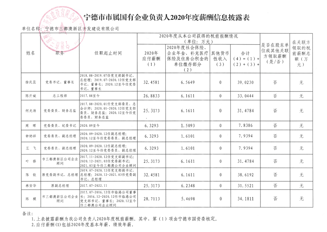 宁德市三都澳新区开发建设有限公司2020年度企业负责人薪酬披露公告