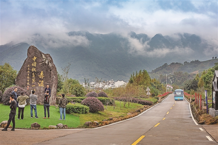 在挖掘文化过程中,这些特色文化也成了赤溪村的旅游标志,找准旅游发展方向。到赤溪的游客,都会到村里的中国扶贫第一村展示馆走一走,重温赤溪村减贫智慧。同时,村里还开设了竹筏漂流、瓜果采摘、登山健身、户外体验等多条游览线路,以及杜家堡古民居群、云顶玻璃栈道、田园自然风光、森林养生基地等特色旅游项目,丰富游客体验,增加旅游收入。