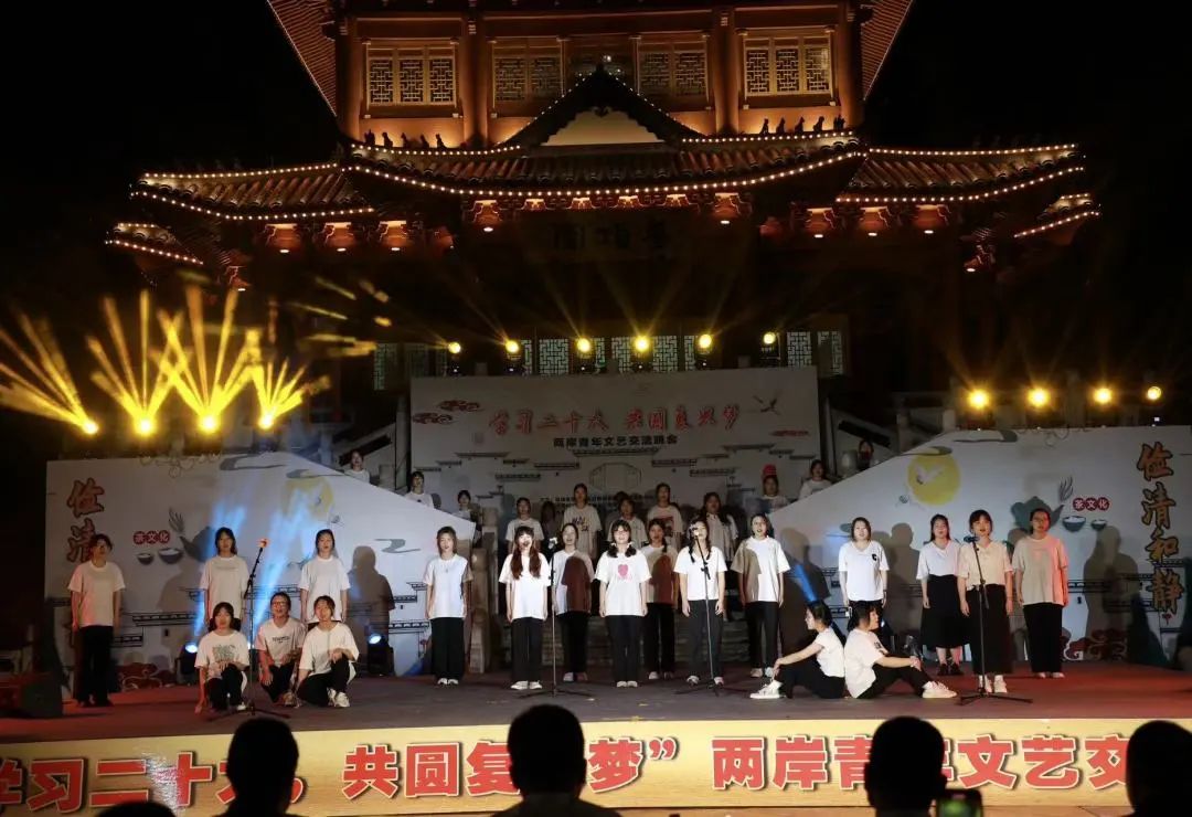 当天晚上,以“学习二十大,共圆复兴梦”为主题的两岸青年文艺交流晚会在梦顶阁上演。丰富多彩的舞美、绚丽夺目的灯光,两岸青年齐聚一堂,共同为大家带来精彩的节目。诗朗诵《梦顶山组诗》、舞蹈《山南笠影》《舞动青春》、茶艺书法《书香新时代 福茶飘万家》、歌曲《大海》《淋雨一起走》......台湾1994年金曲奖新人奖得主,平潭海峡流行音乐协会监事长blues先生的木吉他弹唱《Heart of gold》更是将晚会推向了高潮。整场演出歌舞交融,气氛欢悦。最后,晚会在饱含对党和祖国的热爱,同时又怀揣着浓厚家国情怀的歌声中落下帷幕。