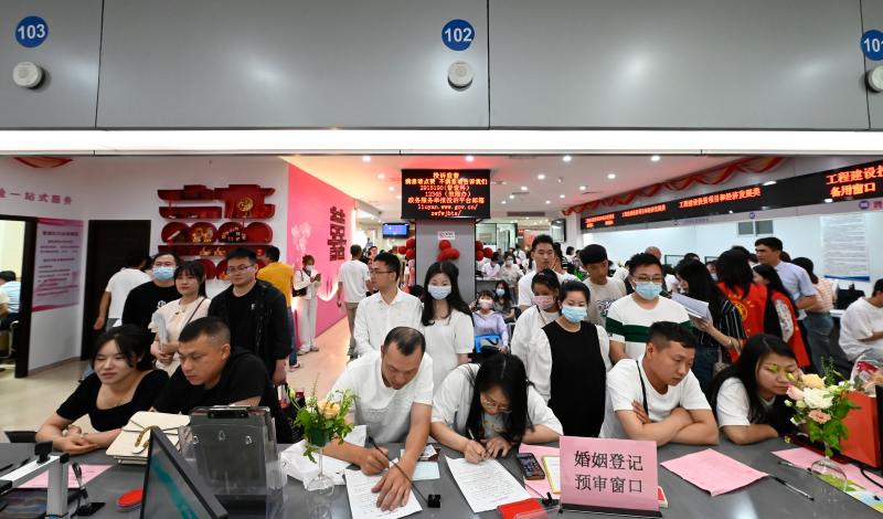 5月20日当天早上9时许,区政务服务中心婚姻登记窗口看到,工作人员们全员上岗,为“爱”加班,为138对新人办理婚姻登记。同时开展‘存正心、守正道、养正气’岗位践新风520活动,为准新人们提供“婚育一件事”登记以及婚孕检一站式服务。前来领证的新人可到婚检窗口享受免费的婚前孕前健康检查,对于有生育登记需要的新人,在领结婚证的过程中可完成生育登记,一步到位,方便群众。除此之外,现场还免费提供头纱、玫瑰花、伴手礼等道具,让准新人们拥有更加甜蜜美好的领证仪式感,以实际行动送上真挚祝福。