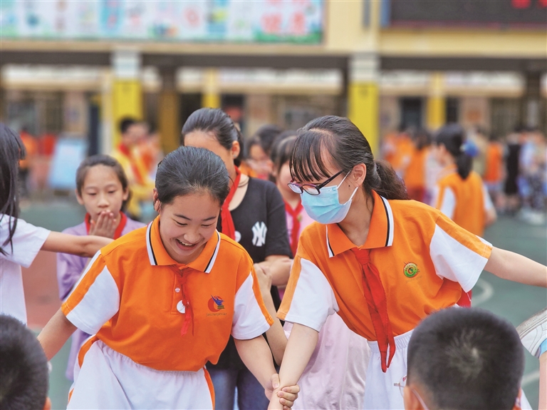今年5月,在城南中心小学心理健康教育周活动启动当天,校园吉祥物“城城”“南南”出现在孩子们的上学路上,与路过的师生们热情拥抱。沿着校园主干道,每个班级都展示出最美微笑照片墙,传递乐观向上的人生态度和友好和谐的人际交往模式,阳光积极的正能量充盈着校园。