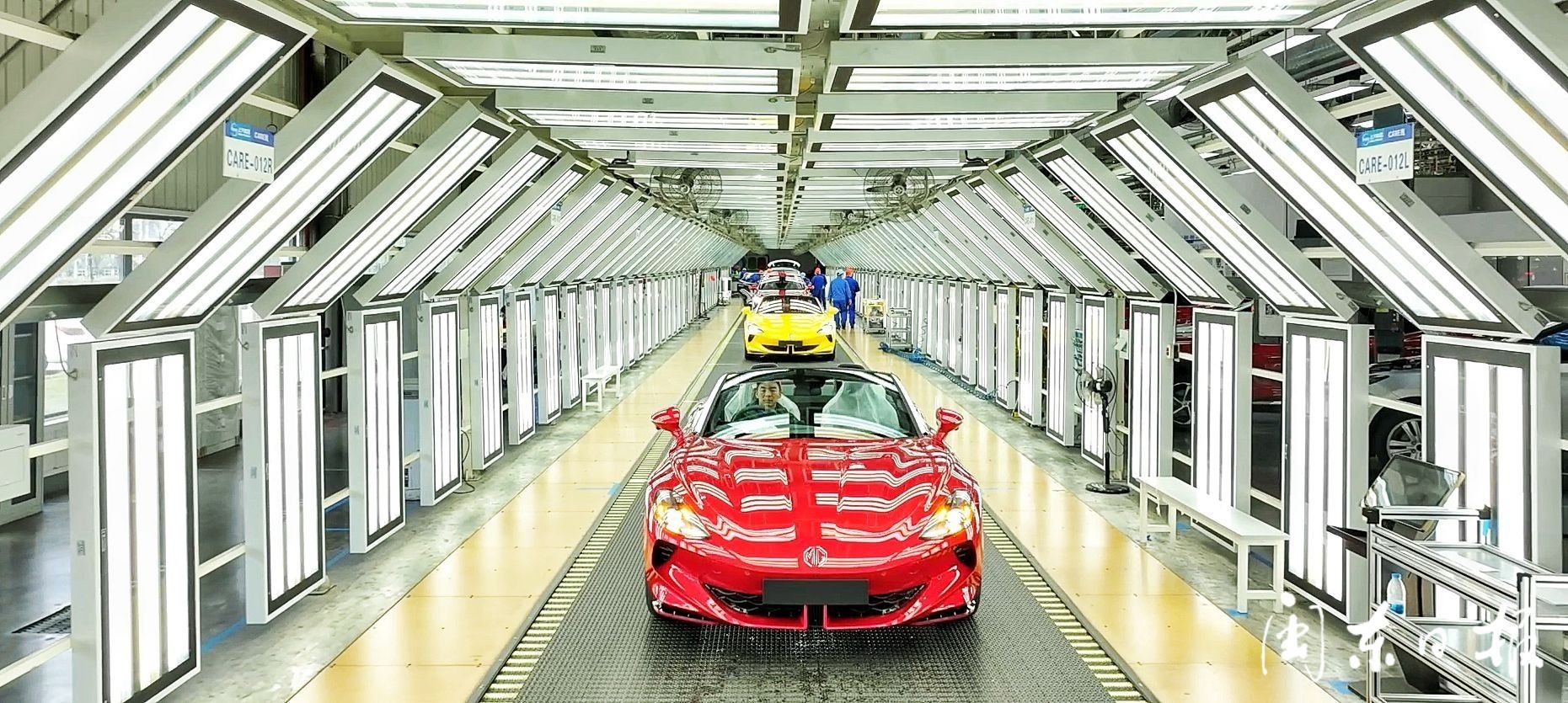 在上汽宁德基地展厅,一辆鲜艳的红色电动轿跑引人注目。这是上汽宁德基地去年落地的上汽乘用车MG品牌第一辆纯电跑车MG Cyberster,车型搭载剪刀门、软顶敞篷、穹顶等配置。项目从工程TG2数据发布到量产,时间短、任务重,挑战所有全新车型项目中的最短实施周期。