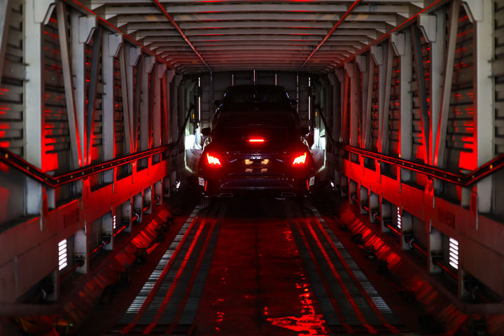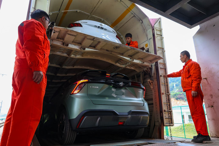 2月8日,在宁德陆港(铁路专用线),商品车在装载车厢内部行驶。